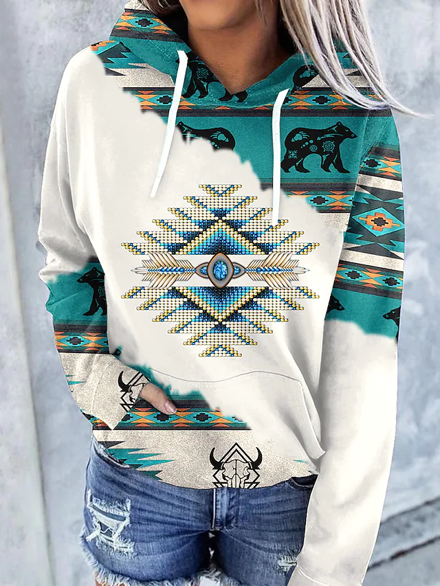 Womens Long Sleeve Hoodie Aztec Geometric Print Drawstring Color Block Hooded Sweatshirt Pullover Tops With Pockets