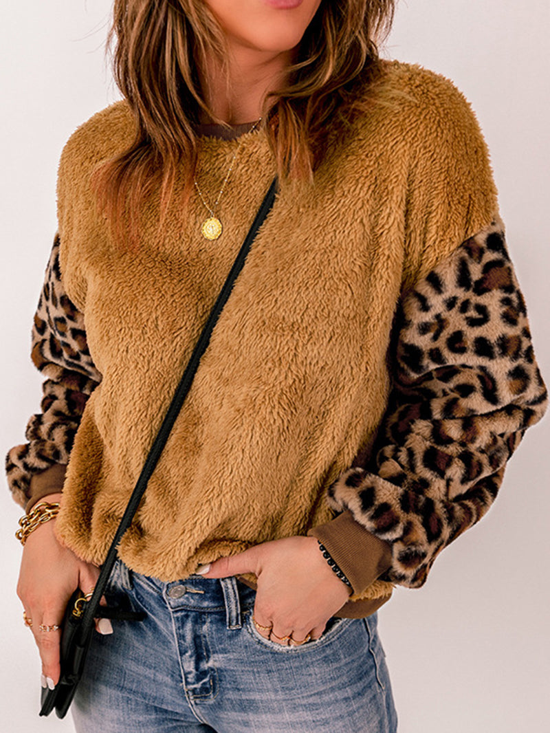Drop Shoulder Leopard Sleeve Furry Hoodies & Sweatshirt
