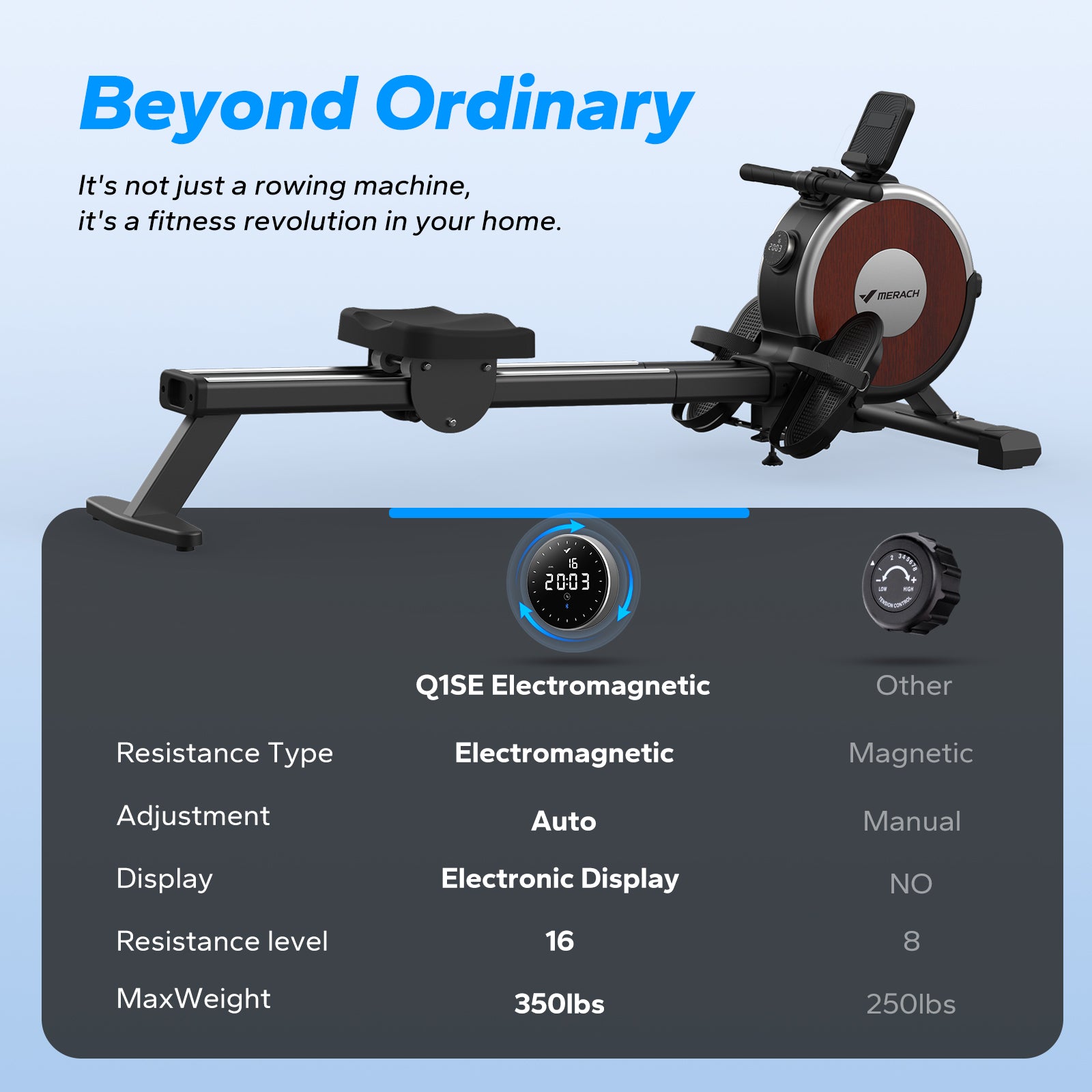 Technologie MERACH GO : Le rameur électromagnétique Q1S dispose d'un bouton de résistance avec suivi automatique, pendant votre entraînement, il sera automatiquement ajusté à la plage cible sur votre rameur pour vous. Libérez vos mains et concentrez-vous sur vos entraînements.