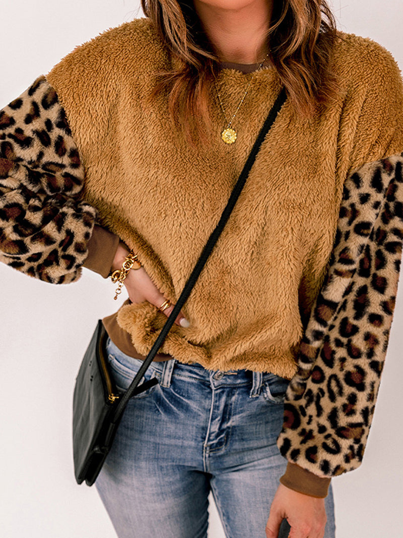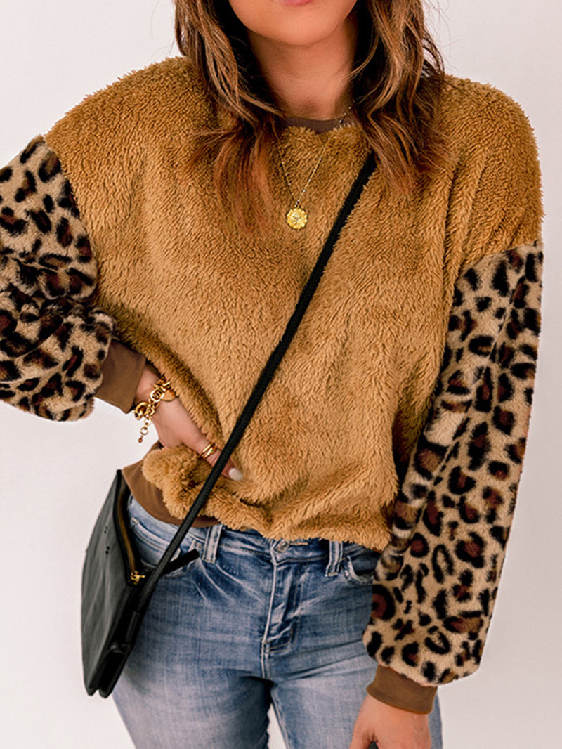 Drop Shoulder Leopard Sleeve Furry Hoodies & Sweatshirt