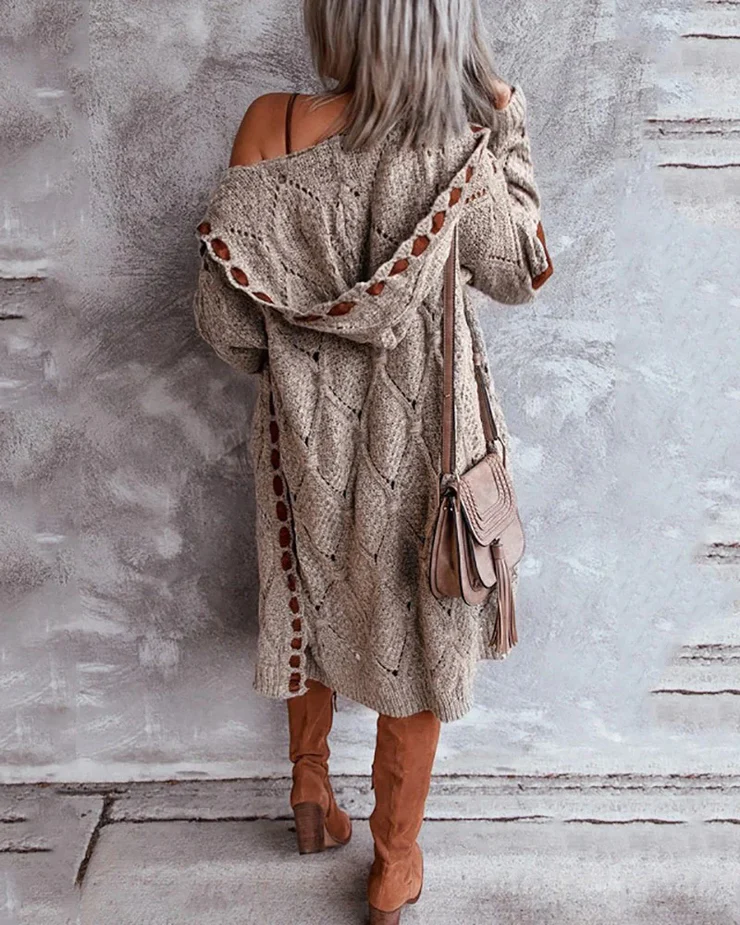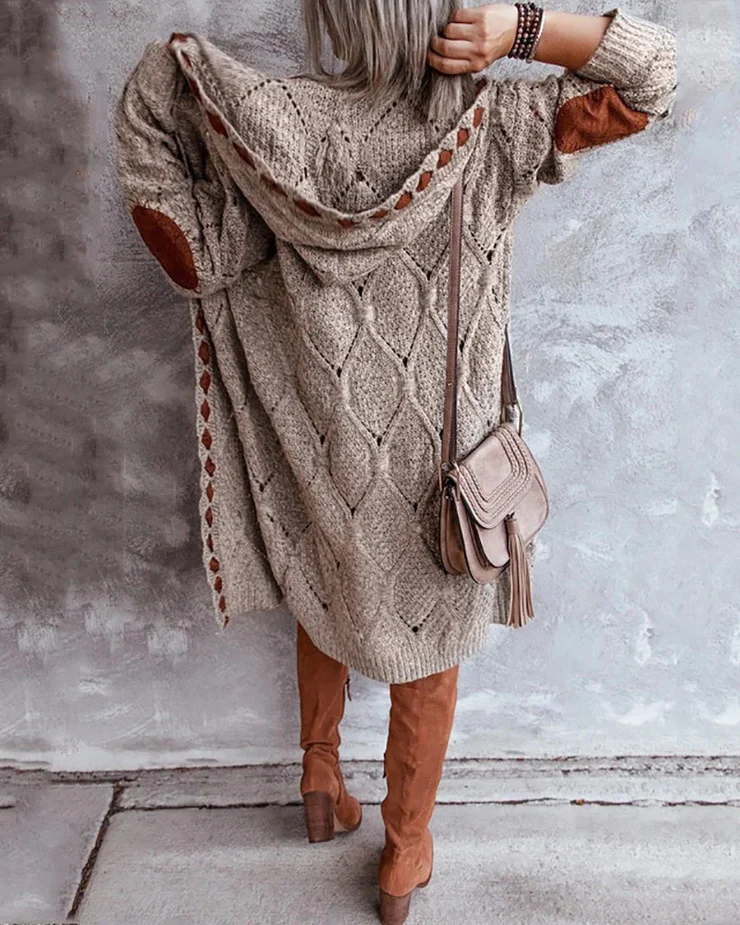 Wrap yourself up with this vintage-inspired sweater cardigan featuring a luxurious diamond pattern cable knit and detailing along the open front. Patches on the elbows give this cozy extra long cardigan a “worn out” look that is right on-trend and perfect for pairing with a t-shirt, camisole, blouse, and jeans. A wide hood offers extra warmth. Machine wash normal with light colors or hand wash. May be hung up to dry or lay flat. Light ironing if needed.