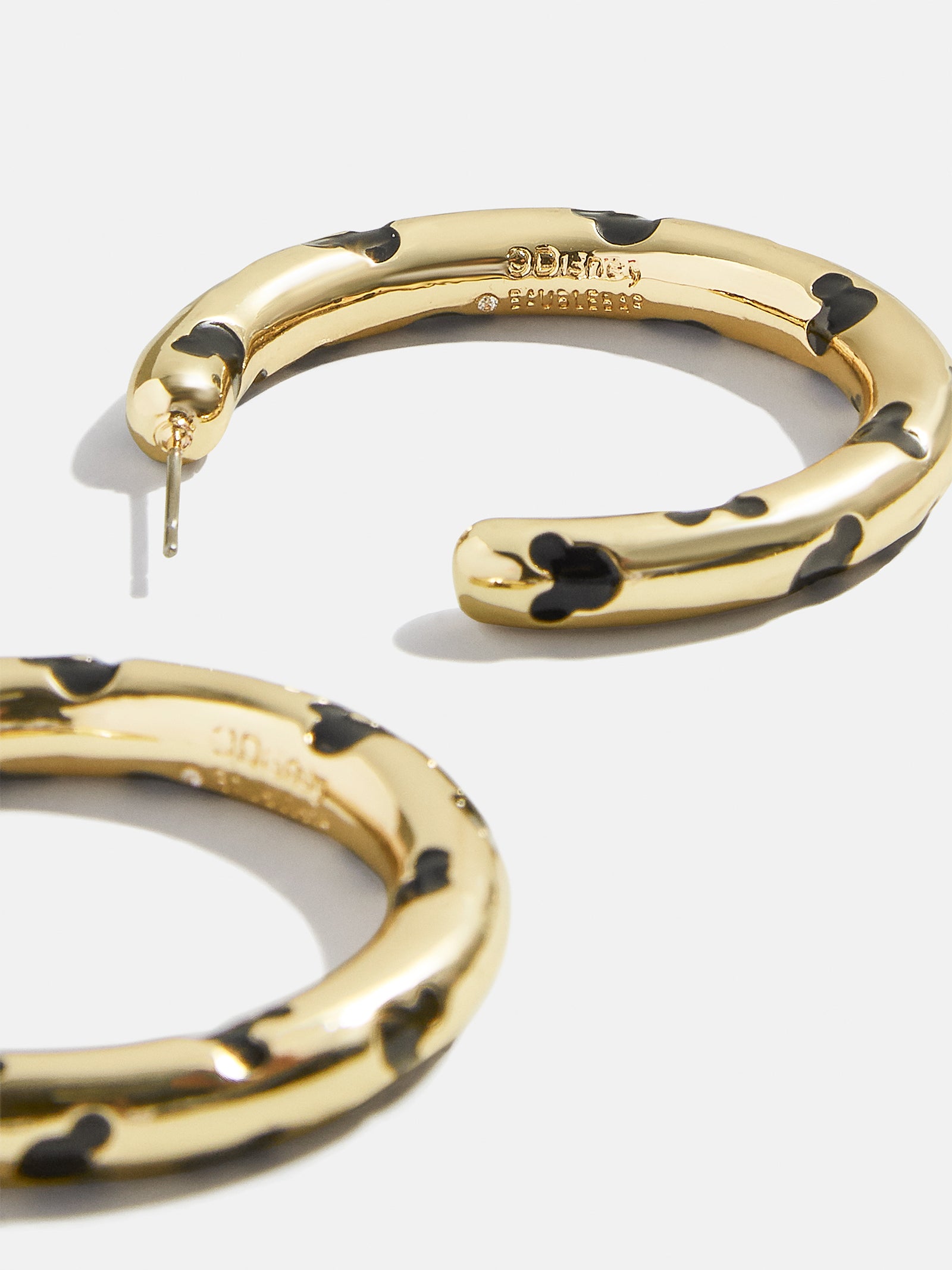 Keep Mickey in the loop with these Mickey Mouse Disney Gold Hoop Earrings. To the untrained eye. these might just be your classic gold hoops. But a closer look will show delicate Disney detailing in either black or clear. It's all the style of an everyday hoop — with a charming sprinkle of Disney magic.