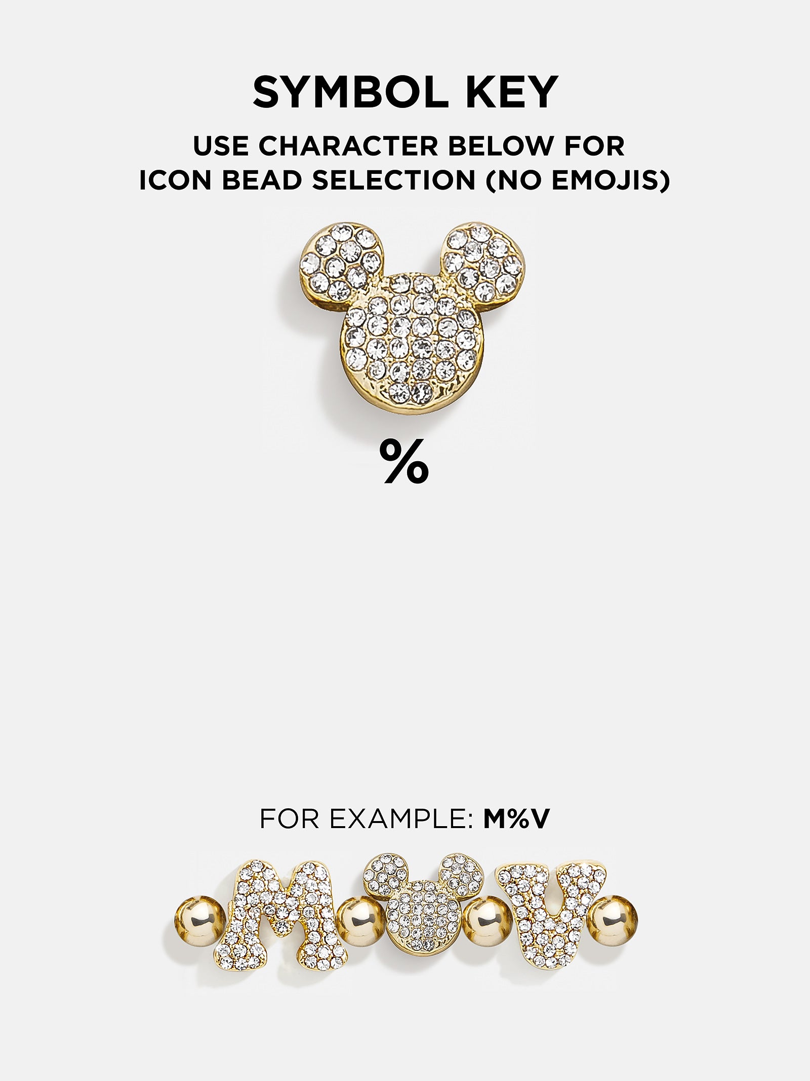 We took our best-selling Custom Pisa Bracelet and gave it a Retro spin - plus a hint of Disney fun. The Mickey Mouse Disney Custom Pisa Bracelet - Retro features pavé letter beads in a nostalgic. bubbly font that are flanked by our signature Pisa gold ball beads. A singular bead sits in between each letter and is accented with a pavé Mickey Mouse bead. Even better? This design is a stretch bracelet. meaning you can take it on and off with ease. Whether you pick a name. phrase or place. we're certain this is a piece you'll want to keep in your everyday stack. See our Letter Key for all options available. This bracelet features 4mm beads.
