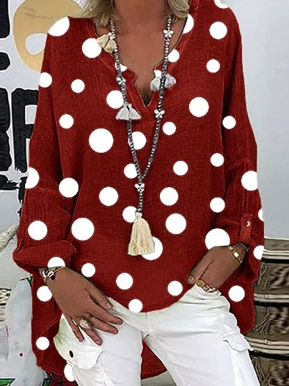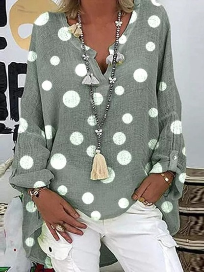 THIS BLOUSE TOP FEATURES OVERSIZED LONG SLEEVES AND A ROUND COLLAR WITH A V-NECK, GIVING IT A CLASSIC, RELAXED FIT. THE LONG SLEEVES AND BELOW THE WAIST LENGTH COMPLEMENTS DENIM OR SLACKS, MAKING IT VERSATILE FOR ANY TIME. WEAR THIS WHITE POLKA DOT TUNIC TOP TUCKED IN OR LOOSE FOR A BOHO-CHIC LOOK. WASH IN GENTLE OR DELICATE CYCLE WITH LIGHT COLORS. KEEP AWAY FROM DARK COLORS.