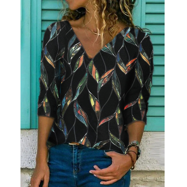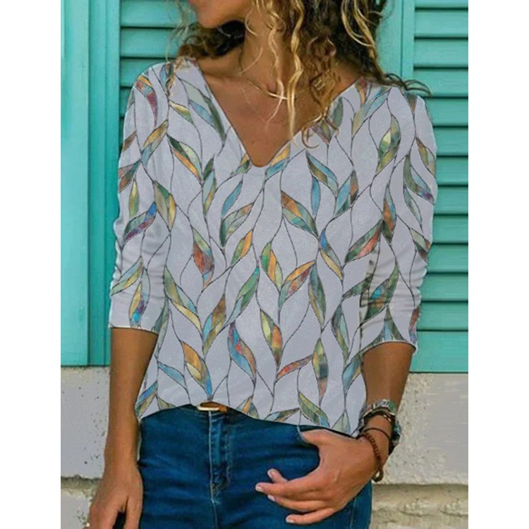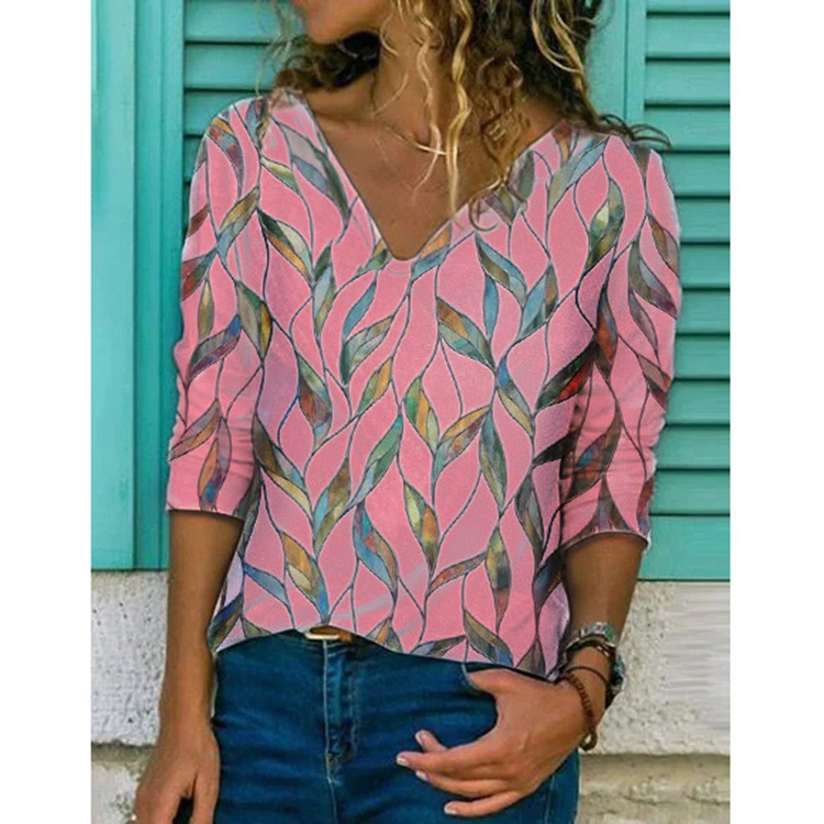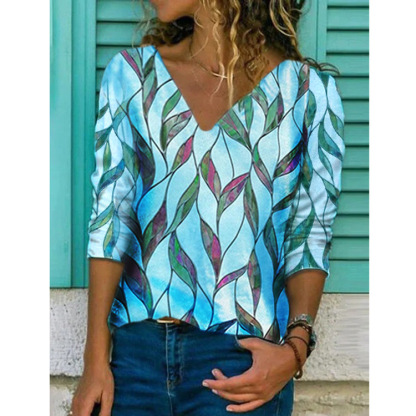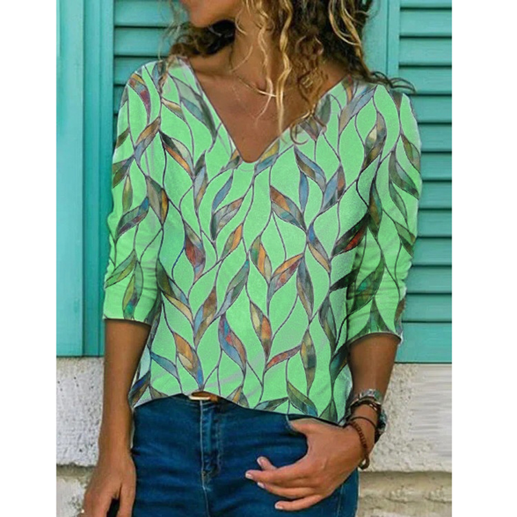 Women's Casual Fashion Pullover Loose V-Neck Leaf Print